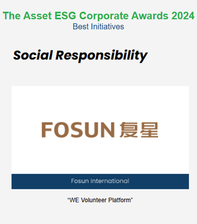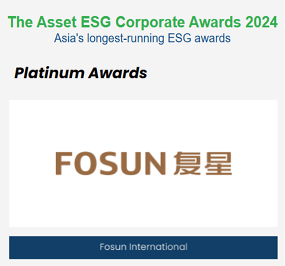 《财资》旗下ESG企业大奖的评选历时多年,是亚太地区处于领先地位的 ESG奖项之一。本次复星国际获评《财资》ESG企业大奖铂金奖,表彰公司在财务业绩、企业管治、社会责任、环境保护、投资者关系、信息披露及企业传播等范畴的卓越表现。其他同时获得“2024年财资ESG企业大奖--铂金奖”的公司包括中国银行(香港)、中国海外发展、中国联通、嘉里建设、领展、瑞安房地产等。