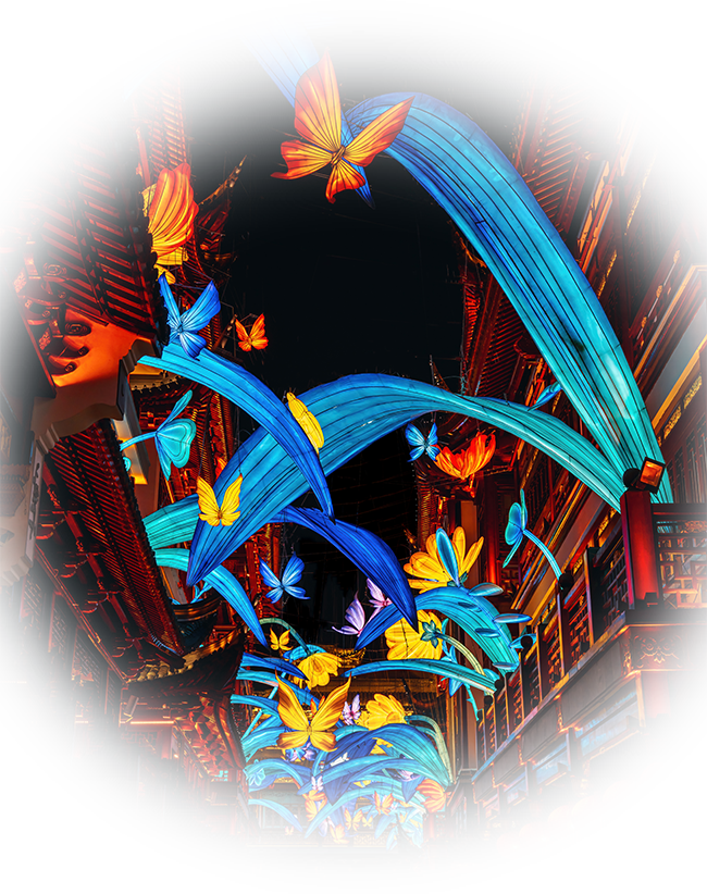 “去年元夜时,花市灯如昼”。穿越豫园灯会三十年灯彩历程,一次欣赏遍中国十大灯彩流派的经典造型。豫园老街上造型缤纷的灯笼,寓意美好气息,感受中国灯彩艺术的和合之美。