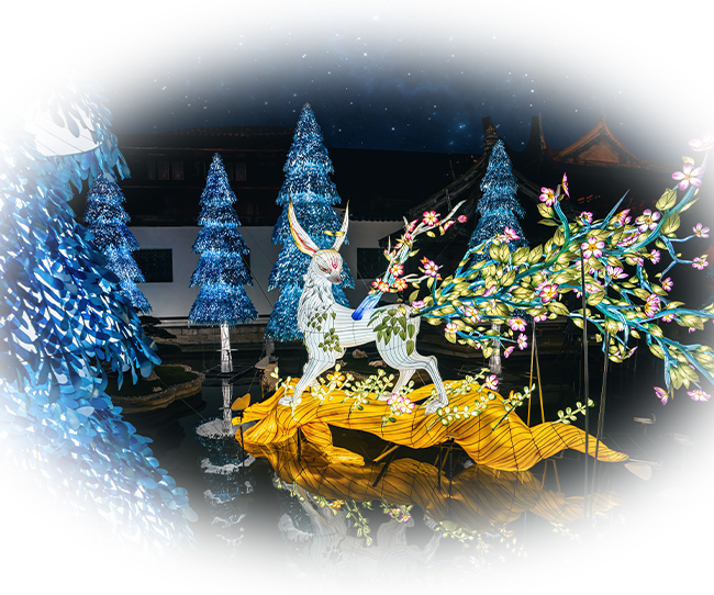 优雅壮丽的水杉灯组呈现神秘森林景观,从花丛中走出的白色小狐狸乘黄周身花藤环绕,象征旺盛生命力。生机勃勃,祥瑞之气满载,寓意「飞黄腾达」,为来年注入福运!