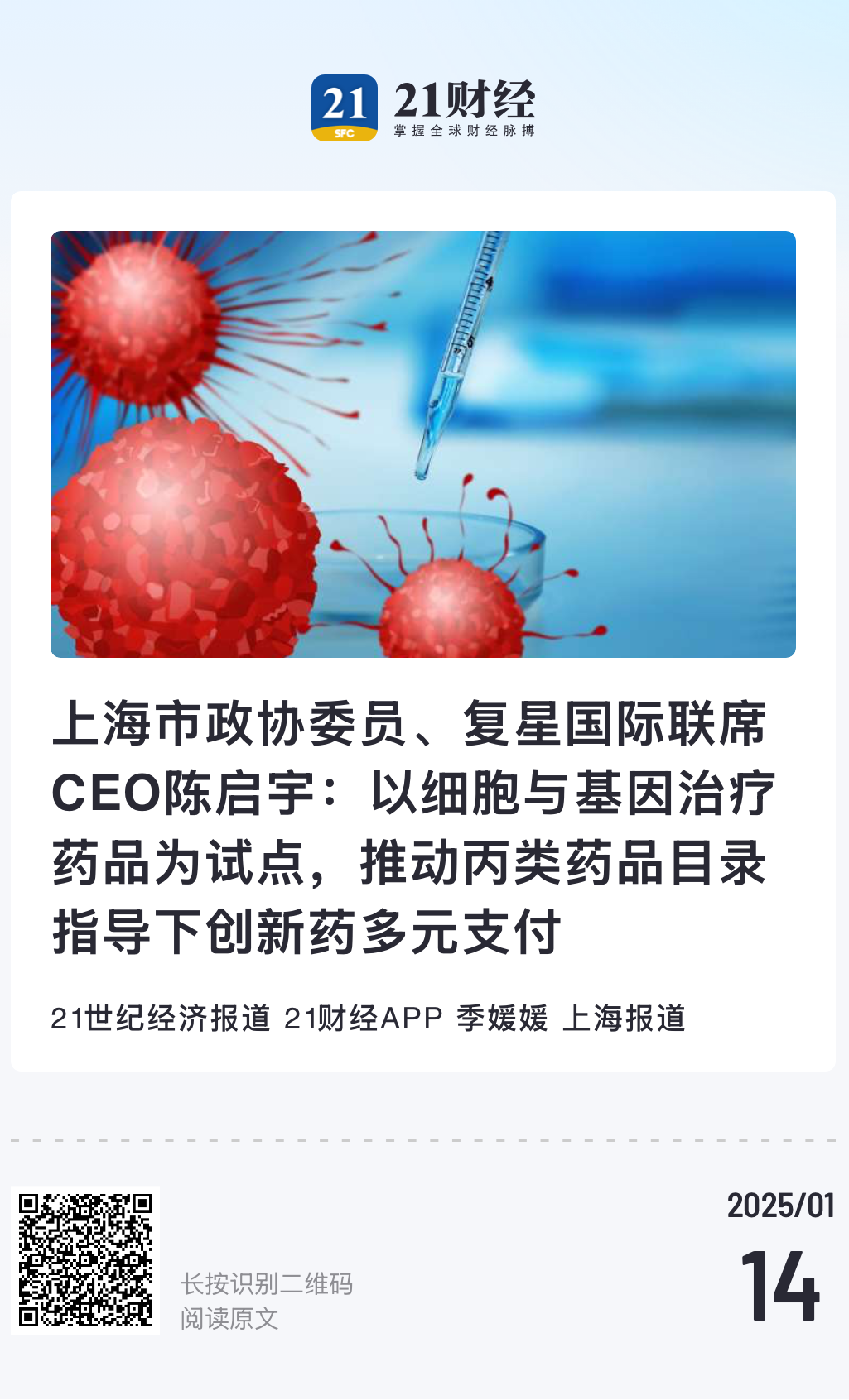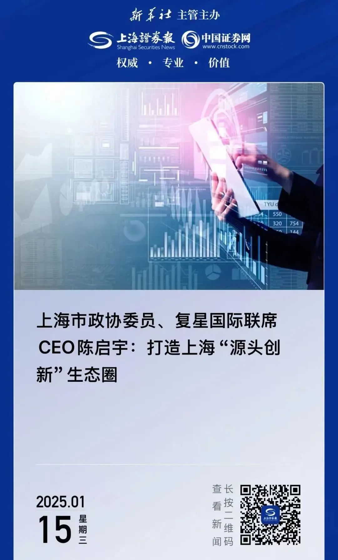 中国人民政治协商会议上海市第十四届委员会第三次会议于1月14日至17日召开,顺利完成各项议程,于17日下午圆满闭幕。会议期间,上海市政协常委、复星国际联席CEO陈启宇提交四份提案,从源头创新、康复医疗、多元支付等多方面、多举措建言献策上海生物医药产业发展。上海生物医药产业正处于换挡提质期,陈启宇倡导进一步鼓励创新策源,助推上海全力打造具有全球影响力的生物医药产业创新高地。