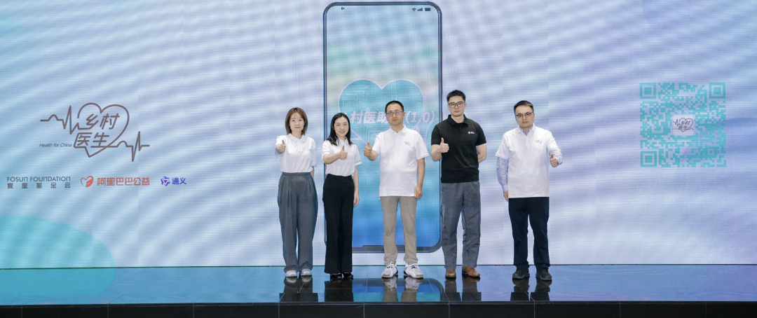 复星基金会副秘书长袁文婕(左一)、阿里巴巴公益基金会秘书长姚瑶(左二)、通义实验室高级产品运营专家毕超(右二)、复星健康董事长兼首席执行官胡航(右一)共同见证AI村医助手上线